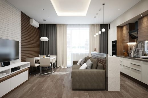 Nội thất căn hộ thiết kế theo xu hướng phòng khách kết hợp với tủ bếp nhằm giúp tiết kiệm không gian sử dụng tối đa nhất cho các căn hộ có diện tích nhỏ hẹp.